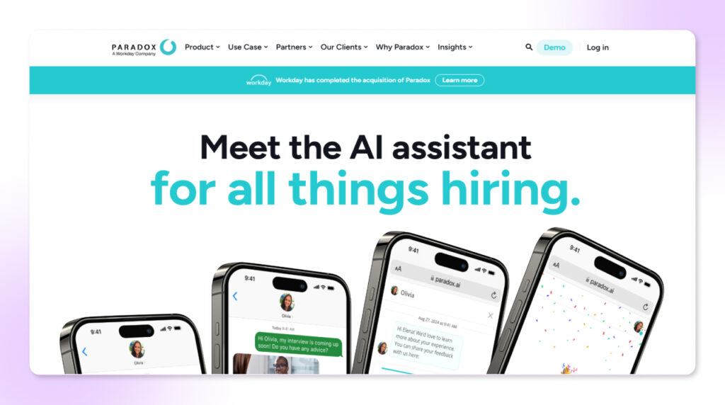 Paradox offers a conversational AI assistant named Olivia that automates candidate engagement and recruitment communication.